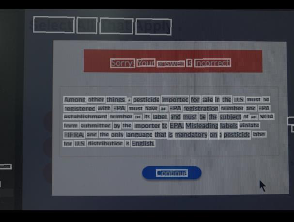 前面大龙哥说过,我们的美国账号要卖杀虫剂通过考试就可以了,今天找产品遇到了杀虫剂产品,想着迟早要开,就花时间去弄了。考试先是一些视频课程,中间穿插考试题目,我英语不行,听不懂,所以我是用软件翻译题目的意思再作答,有些题目简单,看一下就知道选哪个。有些更深入的就不行,第一次错误会弹出界面,是关于该题目答案的提示视频,英语好看视频就能过了。